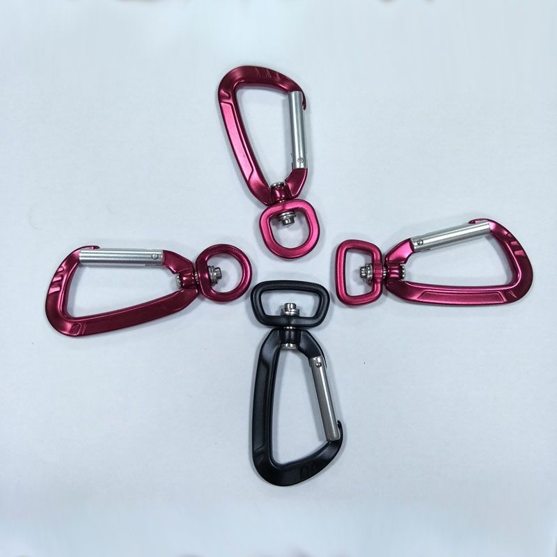 Different shaped anodized aluminum alloy carabiner. Light weight aluminum cold forged carabiner for tactical, rescue, rigging and rope access applications. Auto locking mechanism allows for 4 kN strength. It has superior corrosion resistance and greater strength. Weighing only 22 g and feature a wide rope-bearing surface, the Kimjee® Carabiner is strong enough to fit your pet leashes.
