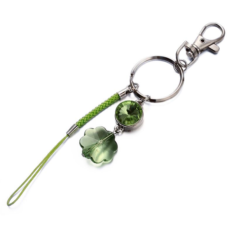 Candy green flower key chain wholesale, green phone string and shape of flower crystal charm key chain, Eco and nice. With the green nylon string, you could hold your phone, purse, bags and more. Or you also could hold the key on the ring. And there are many colors in stock. You could choose the color of string, crystal, even the key chain hook. The rings also could be different.