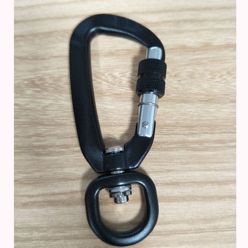 puppy accessories online – black screw lock swivel carabiner. Kimjee is the large and leading manufacturer of Personalised aluminum swivel dog lead hooks china. The black swivel carabiner clip ensures the occasional escape will not happen.The traditional clip on most leashes will on occasion allow the collar ring to slip right through and we have an AWOL dog on the run. Another feature that people love this carabiner is the thick handle that you can hold securely in your hand.